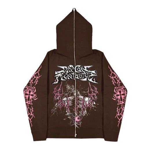Punk Goth Oversized Print Hoodies Women Men Streetwear Zip Up Hoodie Y2k Long Sleeve Hooded Sweatshirt Loose Retro Coats Tops