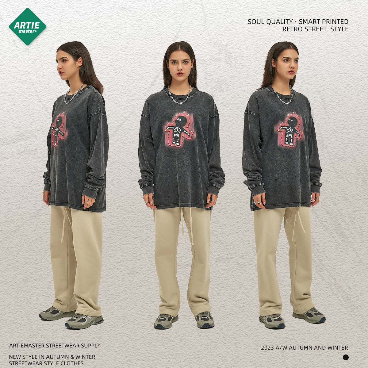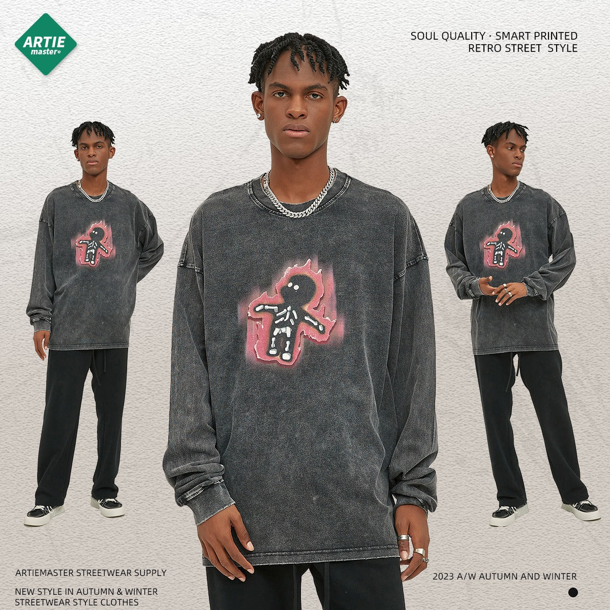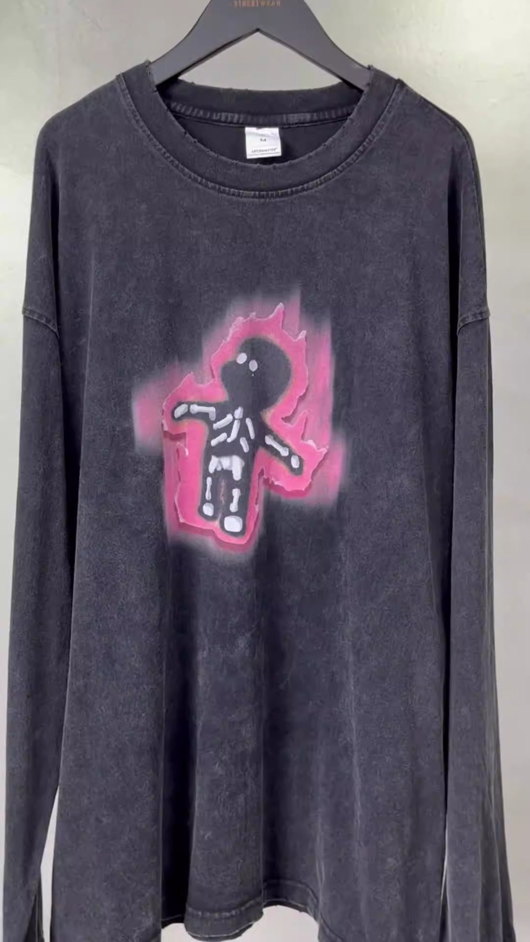 Autumn and Winter New Cartoon White Ink Digital Direct Printing Men's Long sleeved Washed Old Men's T-shirt